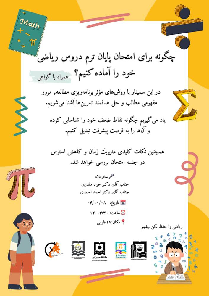 انجمن علمی ریاضی با همکاری انجمن‌های علمی دانشکده فنی و مهندسی دانشگاه هرمزگان برگزار می‌نماید: