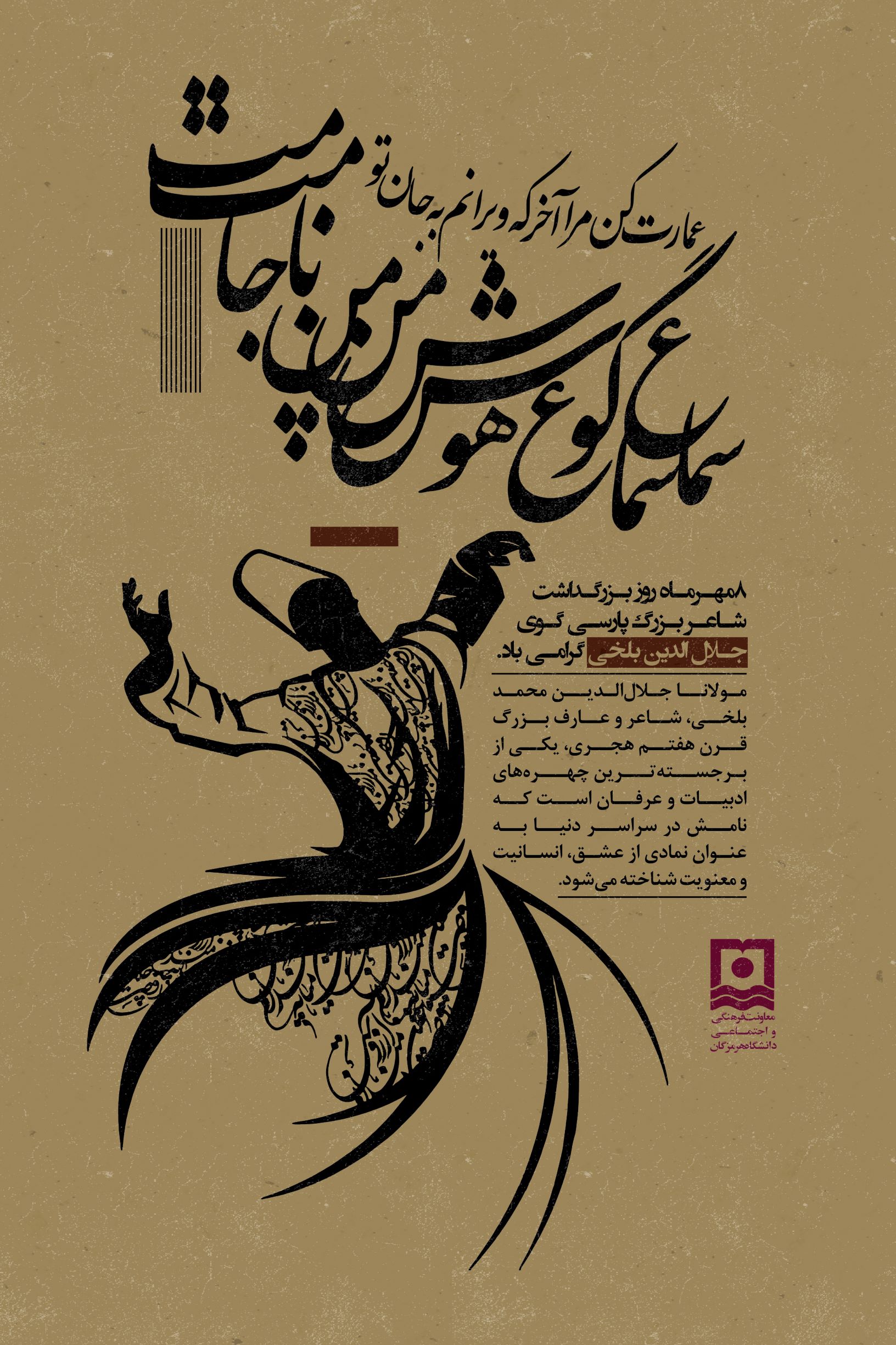 به مناسبت هشتم مهر، سالروز بزرگداشت مولوی شاعر و عارف نامدار ایرانی، دکتر کریمی- معاون فرهنگی و اجتماعی دانشگاه هرمزگان پیامی صادر کرد. در این پیام بر نقش اندیشه‌های مولوی در ترویج عشق، اخلاق و حقیقت‌جویی در میان جامعه دانشگاهی تأکید شده است.