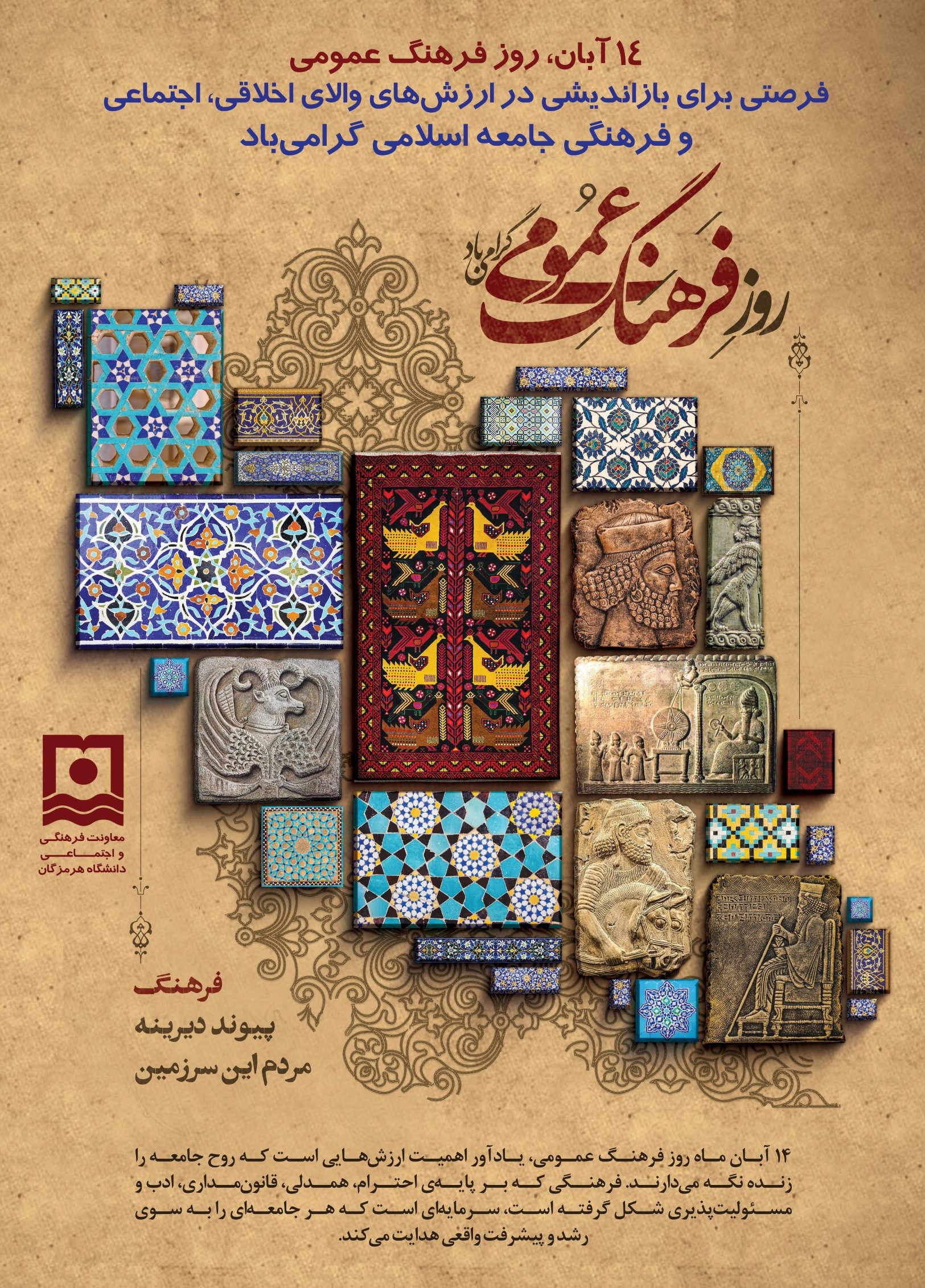 در پیامی جناب آقای دکتر کریمی- معاون فرهنگی و اجتماعی دانشگاه هرمزگان، هویت ملی و دینی ایران همواره در کنار هم، با تکیه بر میراث فرهنگی و ادبی مشترک، بنیان همبستگی و بلوغ فرهنگی جامعه را شکل داده‌اند. روز فرهنگ عمومی یادآور این است که با شناخت ریشه‌ها، تقویت گفت‌وگوی اخلاقی و احترام به تفاوت‌ها، می‌توانیم پیوندهای اجتماعی را استوارتر کرده و فرهنگ را به امری زنده، پویا و متعلق به همه بدل کنیم.